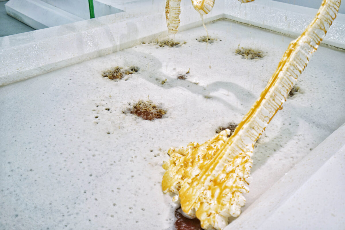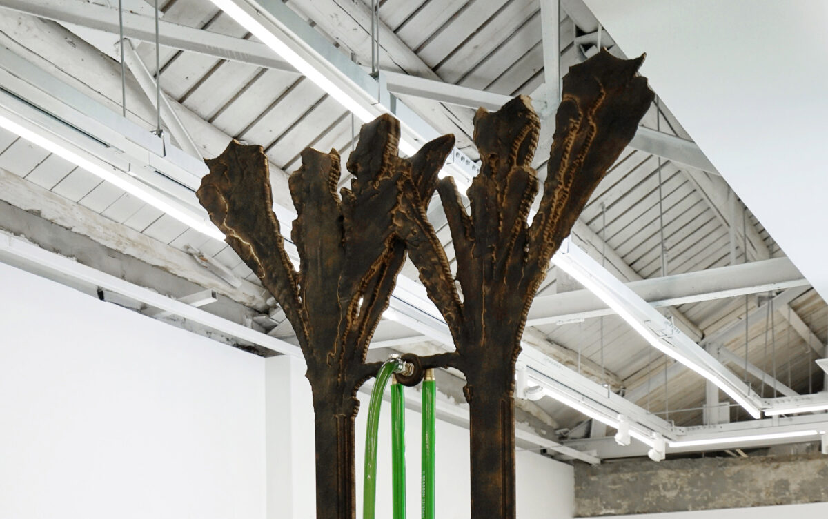 Conjure a Compo Site describes a composite dynamic field. Formally, the whole of the exhibition could be considered as a melted public sculpture, a micro social machine, links between the hidden mechanism, internally manifested large-scale assemblage, and the architectural forms of the sculptures are tightly fastened, all faithfully seeing to the layering, spiral rules of external reception and internal consumption. Feng Zhixuan’s sculptures often use inexpensive materials, and are often transformed from a negative structure to a physical entity through casting means; then the artist adds extra materials (charcoal, quartz, powered gold, etc.) to maintain a stable hybrid state. As Feng develops his practice, he tries to turn the sculptural space inside out, reveals the internal structure and makes it a component that has to be accounted for. Stripping polyurethane foam from construction materials, Feng also eagerly and discreetly examines the accelerated contemporary society. Additionally, shots of foreign images and insertions of hybrid materials bring the sculptural works closer to the nature of the anxious society, and closer to greater complexity and instability.
